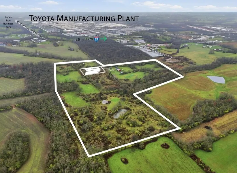 A noteworthy opportunity for investors and developers for over 40 acres of land situated near Toyota Motor Manufacturing and I-75 in Georgetown. The property is currently zoned A-1, with 13 acres within the Georgetown-Scott County Comprehensive Plan FLU, indicating a potential zone change for Industrial Use. The properties situated to the south and west are designated as I-1 and are incorporated within the Georgetown municipal boundaries. Prime real estate in a prime location, offering endless possibilities, and conveniently located off Cherry Blossom Way, just 1.5 miles from 1-75. Nearby businesses include Toyota Motor Manufacturing (currently employing over 9,500), Aichi Forge, ORBIS, and Lanes Run Business Park. Consistently recognized as one of Kentucky's fastest-growing markets, Georgetown continues to experience ongoing expansion across all sectors. This property's strategic locati...