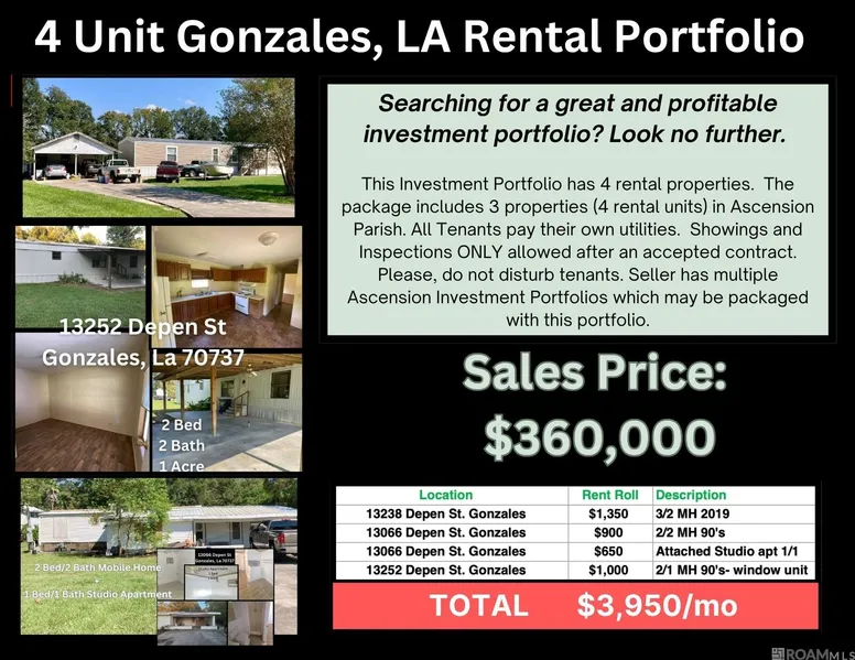 DEPEND RD PACKAGE - 3 PROPERTIES/ 4 RENTAL UNITS 3 MOBILE HOMES, one with small attached apartment ADDRESSES: 13066 Depen St. (2 units); 13238 Depen St.; 13252 Depen St. TOTAL PRICE: = $360,000. TOTAL INCOME PER MONTH: $3950 OTHER INVESTMENT PORTFOLIO PACKAGES AVAILABLE. • Hwy 621 Package LCADB #42717389 • Arceneaux Rd Package LACDB #42717580 • Bluff Rd Rd Package LACDB #42717226 • A Mobile Home on an acre on Swamp Rd can be purchased as an add-on with any of the packages within for $139,000 inquire for more details.