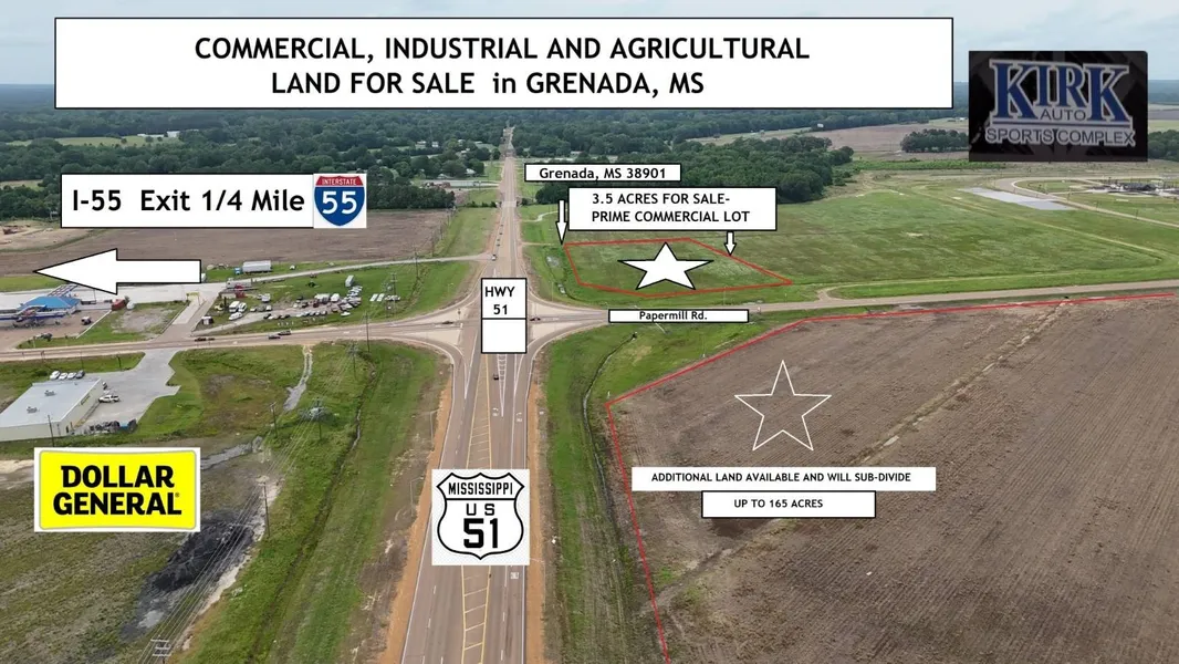 3.5 AC Prime Commercial - Hotel, Resturant, Mixed-Use, Retail... Prime Commercial Land in Grenada, MS - Highway Frontage! An exceptional opportunity for development! This expansive 3.5-acre commercial property is strategically located with prime visibility from Interstate 55 to the west and direct access along Hwy 51 and Papermill Road. Perfect for companies looking to capitalize on high-traffic areas, this property offers a wealth of possibilities for growth and expansion. Don't miss your chance to secure a key piece of commercial real estate in a prime Grenada location! North Grenada Exit at Papermill Rd.. Strong Employment Growth- The city has experienced a marked increase in employment, with 900 new jobs not yet announced and other local companies relocating up to 1,800 employees to Grenada. Grenada has also benefited from industrial developments of $550+ million along with several ...