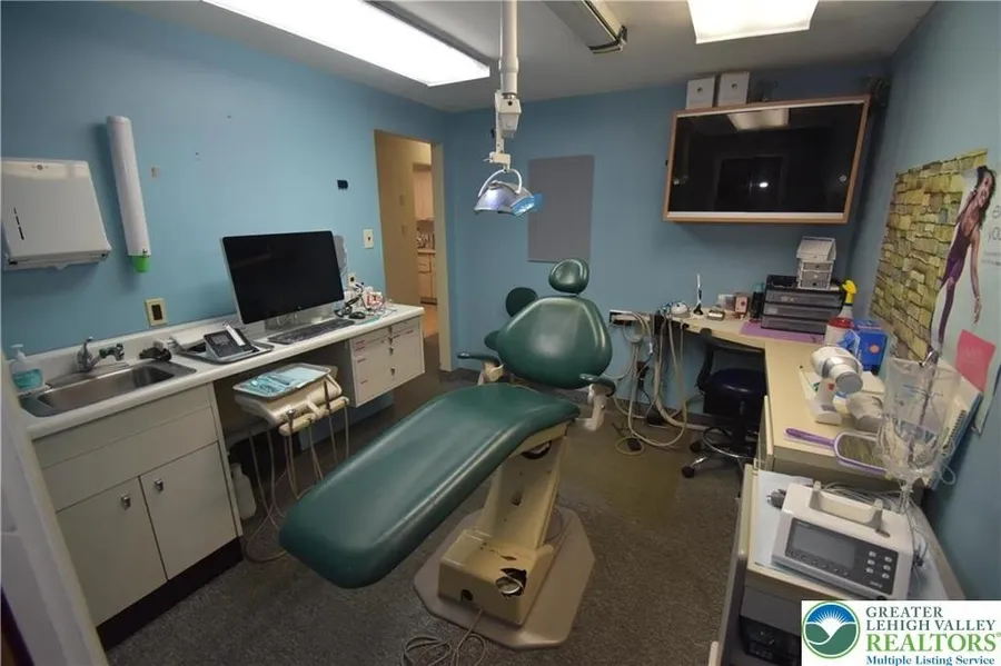 Well maintained professional building at the corner of Main St and Hampton in Hellertown. Previously a dental office. This option divides out an available 400 sq ft office space. It will provide direct access to the common hall and access to a common space bathroom. Other options are, entire 2000 sqft space, Front half (approximately 1000sqft) back half (approx 1000 sqft), and 300 sq ft space are all possibilities for this rental. Plenty of options to fit different size and application needs.