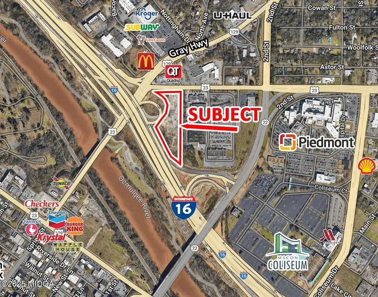 Macon's premier location- commercial piece of property with approximately 590 feet I-16 frontage. Close to new proposed Coliseum, Convention Center, and Medical School. Flat site of approximately 4.84 based on tax information.