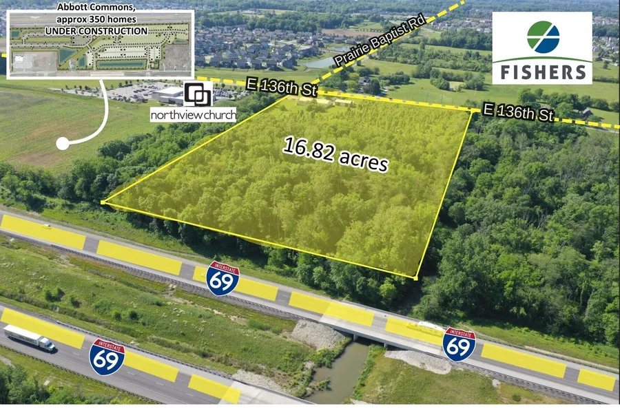 16.82 acres located in a direct path of continued commercial/medical development, at the intersection of 136th Street and Prairie Baptist Rd., with approx 640' of I-69 and 136th Street Frontage. Just east of the Ascension-St. Vincent Fishers Hospital, IU Health Saxony Hospital, Hamilton Town Center, and Ruoff Music Center. 6 Minutes Northeast of Hamilton Southeastern H. S. According to MONEY's Fishers is one of Americas Top 10 Best Places to Live 2019. Fishers leads the country in affordability, quality of life, workforce and business climate. The state’s 6th largest city with a rich blend of businesses and home to the several corporate headquarters.