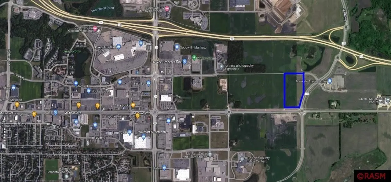 Prime ground available in the East end of Mankato's newest development area. This area is experiencing great growth with the recent completion of the Mankato Travel Center and soon to join with the completion of Truck Center Companies, Kato Mayflower Storage and others. The parcel offers 16.93 acres with three points of access (Adams Street, CNTY RD 12 & CNTY RD 17/Madison Avenue) with utilities along the north side. The parcel is located with easy access to four lane Highway 14 and the nearby round-about connecting heavily traveled Adams Street @ CNTY RD 12. Potential to parcel into thirds.