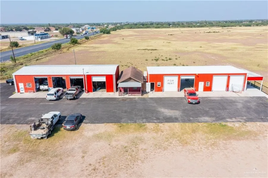 Exterior:Typically a commercial garage building, a large looking structure with several garage bay doors.