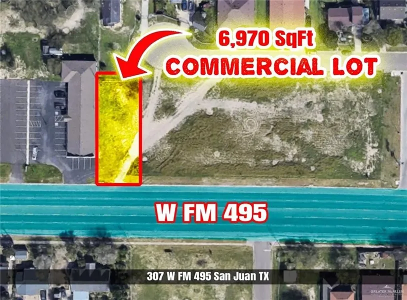 Prime commercial lot at 307 W FM 495, San Juan, TX. This 6,970 SqFt property offers excellent visibility and easy access, just minutes from Veterans Blvd, Raul Longoria Rd, and the Expressway. Surrounded by established businesses, schools, restaurants, and major retailers, it’s an ideal location for retail, office, medical, or a drive-thru concept. All city utilities are available, with water and sewer connections to be completed through the subdivision process. Situated in a rapidly growing area, this lot presents exceptional development potential for investors and business owners. Don’t miss the opportunity to secure a prime spot in one of San Juan’s busiest commercial corridors. Bring your vision and be part of the city’s continued growth.
