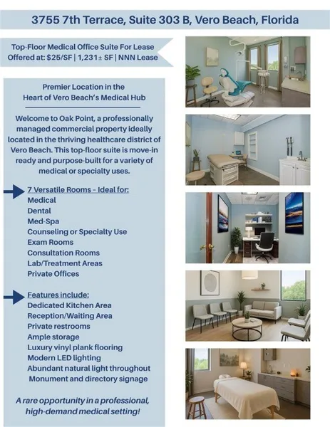 3 MONTHS FREE RENT! Premier Vero Beach Location! Situated in the heart of Vero's thriving medical district, this 1,231 SF suite is move-in ready & ideal for medical, dental, med-spa, or specialty use. Thoughtfully laid out with 7 versatile rooms perfect for exam rooms, consult spaces, doctor's offices, labs, or treatment areas. Features include a private restroom, ample storage, luxury vinyl flooring, modern LED lighting, and abundant natural light throughout. Monument + directory signage offer outstanding visibility. A rare opportunity in a professional, high-demand medical setting!