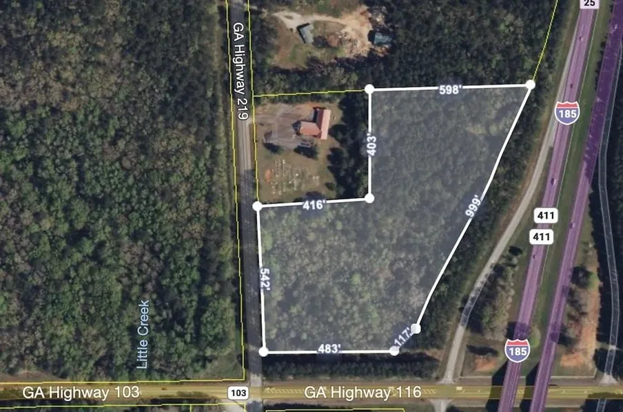 This maybe the best intersection for development in Harris County Ga. This property is on the NW corner of exit 25 on I-185 at the intersections of Hwy 219/103/116. It's 15 minutes to the Columbus area and 15 minutes from West Point. Heavy traffic from Kia, suppliers and employees using Hwy 103 to I-185. Hwy 103 is main connection from I-85 and I-185. Traffic county on Hwy 116 is 4570. I-185 is also heavy traveled from Atl to the beaches in the Fla panhandle.