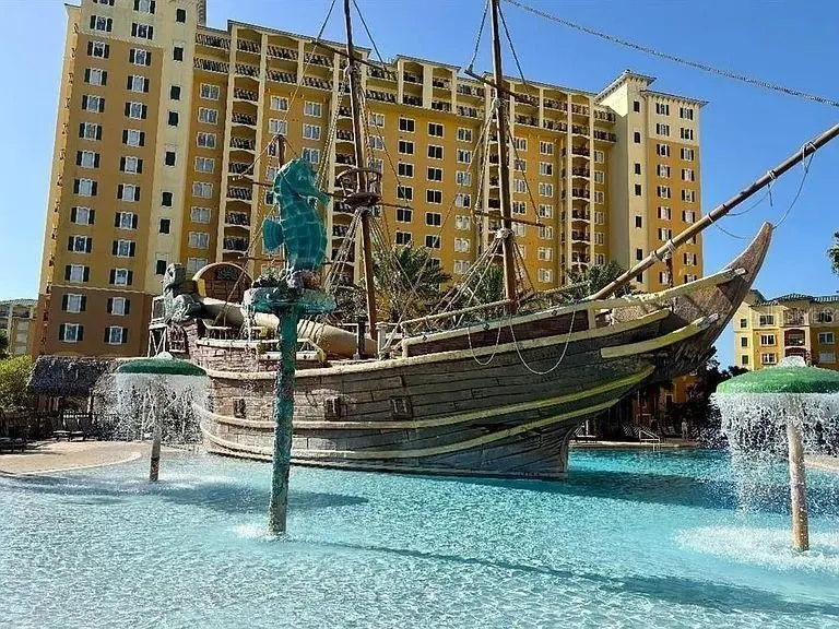 Lake Buena Vista Resort & Spa offers outstanding amenities including a pirate-ship themed pool, resort-style pools, full bar, spa, fitness center, game room, playground, on-site dining, and shuttle service to major theme parks.
