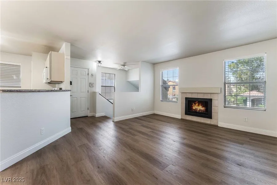 Welcome to this charming 2-bed, 2-bath condo featuring an open floor plan and a cozy fireplace in the living room, enhanced by abundant natural lighting. The kitchen offers ample cabinet space and a convenient pantry, seamlessly connecting to a dining area that opens onto a delightful private patio. Enjoy beautiful wood laminate floors throughout the main living areas and plush carpeting in the bedrooms. The spacious master bedroom includes a ceiling fan and an en-suite bathroom with dual sinks and a relaxing tub. The good-sized guest bedroom and bathroom provide comfort and convenience for visitors. This lovely condo is part of a community that boasts a refreshing pool for your enjoyment.