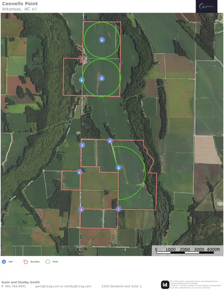 The Connells Point Farm is a well-located, high-quality cotton and grain farm in western Phillips and eastern Monroe Counties, AR. It is situated in a very desirable farming area with excellent underground irrigation water. The farm consists of 910+- total acres with 790.22 cultivated acres. The vast majority of the farm is either pivot irrigated, precision leveled, or furrow irrigated, with only the small pivot corners being non-irrigated.