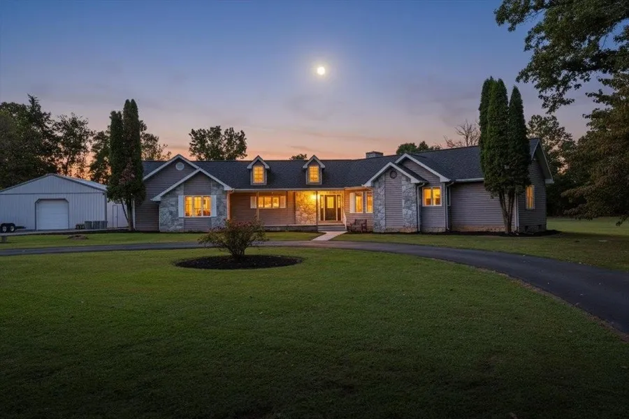 Welcome to 174 Martin St., just minutes from downtown Luray and only 7 miles from Skyline Drive. This contemporary home offers over 3,300 sq. ft. of living space on 2.44 acres, blending small-town charm with Shenandoah Valley adventures. A circular driveway, landscaped yard, and inviting front porch set the tone. Inside, the grand living room boasts floor-to-ceiling windows, vaulted ceilings, and a stone woodstove. The dining room features new windows and sliders opening to a pavilion-covered deck overlooking the large, level backyard. The bright kitchen offers white cabinetry and a walk-in pantry. Down the hall are two bedrooms, a full bath, and a spacious primary suite with whirlpool tub, separate shower, and dual sinks. The finished basement adds a full bath, kitchenette, laundry, and flexible spaces for entertaining, fitness, or play. Ample storage includes an attached 2-car garage, detached 2-car garage, and workshop. Peace of mind comes with recent updates—HVAC (2024), roof and solar (2022). This property truly has it all!