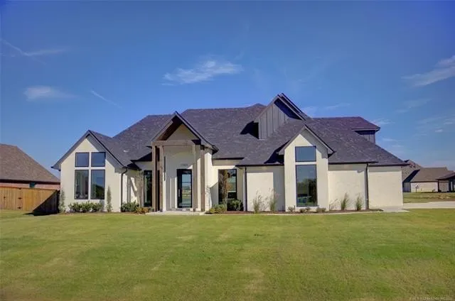 Step into this stunning brand new home in highly desirable Magnolia Heights Neighborhood. Home to the sought after Bixby Schools. Enjoy serene pond views and an abundance of natural light pouring through the expansive windows, creating a warm and inviting atmosphere. The spacious living room boasts a floor to ceiling fireplace with elegant marble tile, perfect for cozy evenings. The flexible floor plan can be configured as five bedrooms with flex room, or four bedrooms plus a game room and office / flex room space - tailored to your lifestyle. Listing agent related to seller.