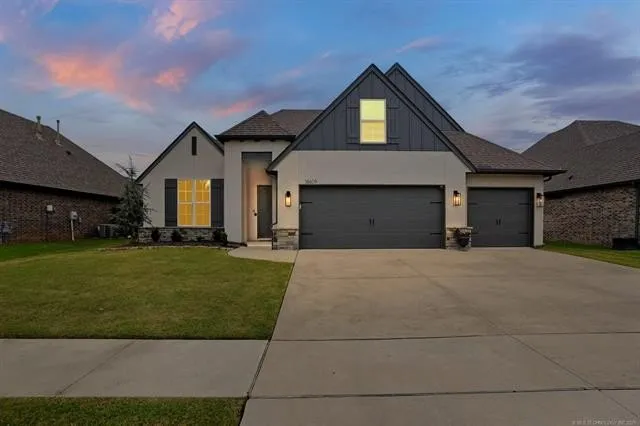 Gorgeous and contemporary 4-bedroom home with hardwood floors, 3 full bathrooms, a game room, a formal office, and a 3-car garage! This well-maintained home features an open-concept floor plan, perfect for entertaining. Beautiful hardwood flooring on the first level, dedicated office with sliding glass doors and huge custom built bookshelves, 3 bedroom downstairs including the primary, and 1 bedroom plus game room and full bathroom upstairs. Large primary bedroom with luxury en suite bath featuring a bathtub, dual shower heads with individual controls, heated flooring, and a heated towel rod! Bright and open kitchen with stainless steel appliances staying including the fridge, granite countertops, and a pantry! Upstairs includes a HUGE game room, a full bath, plus a 4th bedroom with a new and individually controlled heat and air system. Large covered patio in the backyard with a built-in natural gas fire pit that doesn't require propane and a fully fenced-in yard. Large 3-car attached garage with a built-in family safe/shelter. Located in the Cypress Creek neighborhood, which includes a pool, parks, and ponds. Located in the city of Tulsa, which is eligible for the Tulsa Remote program. Only 8-10 mins drive from the new Adams Creek Town Center, which will include shops like Burlington, Five Below, Trader Joe's, and much more (see BrokenArrowOK. gov for more info). Come tour this unique and modern home in Broken Arrow Schools.