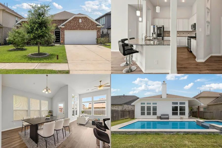 Short Sale Opportunity. Welcome to this stunning contemporary home in desirable Goose Creek Landing, just minutes from I-10, shopping, and dining. Enjoy the serene 19-acre lake, walking trail, and community park right outside your door. Inside, an open and airy floor plan boasts stylish tile floors throughout the main living spaces. The chef’s kitchen shines with granite countertops, stainless steel appliances, a water softener, and includes the refrigerator, washer, dryer, and security system. Retreat to your backyard oasis with a heated pool, hot tub, color-changing lights, and covered patio — perfect for unforgettable gatherings. Don’t miss the chance to make this upgraded beauty yours!