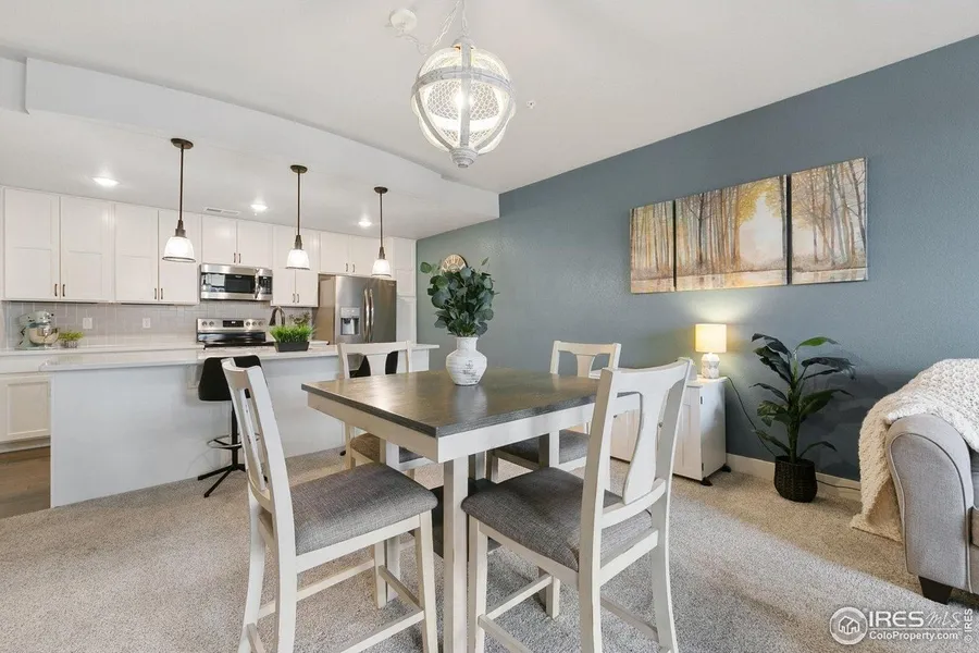 This stunning main-level condo walkable to the Highland Meadows Golf Course offers elevated finishes and incredible amenities! Nestled in the heart of Portofino Flats at La Riva-just steps from the brand-new community center-this 1-bed, 1-bath unit features an oversized kitchen island and designer upgrades. Enter through the secured building entrance or your private, oversized one-car garage conveniently located just across the hall. Inside, natural light floods the space, highlighting the white stone countertops, engineered hardwood floors, and sleek tile finishes. The HOA includes water, sewer, trash service, snow removal, and lawn care. Also included -- the resort-style amenities! Take in breathtaking mountain views while enjoying the outdoor seasonal pool and 10-person hot tub, stay active in the state-of-the-art fitness center, or entertain in the elegant community space. Walk to the golf course clubhouse, the best Italian in town at Pizza Vino or stroll to Mighty River Brewing or hop in your car and arrive at Centerra, Windsor, or Loveland! Access to I-25 is a snap so Denver doesn't feel far away! This is a home you won't want to miss.