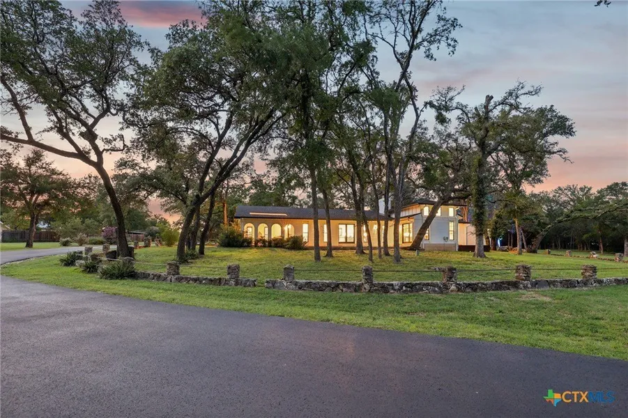 Tucked behind a private gate on 4 oak-studded acres in the coveted North Lake community, 707 Harbor Dr is more than just a home-it's a sanctuary where nature, luxury, and recreation coexist in perfect harmony. This thoughtfully reimagined 3-bedroom, 2-bathroom main residence spans 2,500 square feet and has been completely transformed from the studs up between 2019-2020. Originally crafted in 1978, the home now showcases a stunning modern design infused with timeless materials and meticulous attention to detail. Raised ceilings and Marvin black-framed windows flood the space with natural light, while wide-plank 48"x24" tile floors and solid-core doors add a touch of quiet luxury throughout. At the heart of the home, the gourmet kitchen commands attention with custom walnut cabinetry, sleek Quartz countertops, a granite composite sink, and premium stainless appliances-including a 5-burner induction cooktop and built-in Bosch WiFi coffee maker. The living area features dramatic cathedral ceilings, and the dining room rises to an impressive 12 feet, making gatherings both grand and comfortable. The primary suite is a true retreat, offering double doors to a shaded patio and a spa-like ambiance amid the tranquil landscape. The recent 2022-23 addition of a fully finished 600 sq ft guest house elevates the experience for visitors or multi-generational living. With its own bedroom, bathroom, kitchenette, and living space, guests can enjoy views of the resort-style, multi-tiered pool and hot tub, which flow seamlessly into an expansive sun-shelf and catch basin waterfall feature. Surrounding it all is lush, high-grade artificial turf for year-round vibrancy and minimal upkeep. And for those seeking activity and entertainment, an extended paved area leads to a custom pickleball court-perfect for spirited games with friends or neighbors. A paved drive and ample parking make hosting a breeze, while the short drive to Lake Georgetown offers endless outdoor adventures nearby.