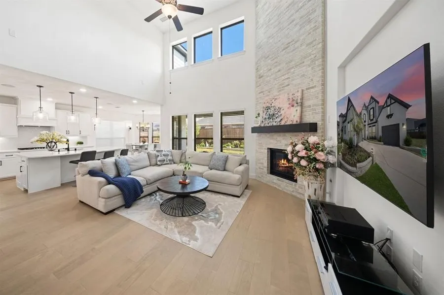 STUNNING modern home that is both elegant and captivating. Meticulous attention to details featuring soaring 20-foot ceilings in the foyer and great room, wrought iron curved staircase with contrasting risers, and light colored engineered hardwood that create a grandeur atmosphere. This open floor plan seamlessly connects the living room, dining area, gourmet kitchen through a spacious butler’s pantry, making it ideal for a large family and for entertaining guests. Abundant windows throughout the house that allow of natural light to flood the rooms and also offer a serene view of the private backyard. The kitchen features quartz countertops, oversized island, gas burner cooktop, sleek shaker style cabinets, a custom wood vent hood, and pot and pan drawers. Amazing floor plan with the primary bedroom and guest room on the first level. Retreat to the primary suite to relax in the resort-style ensuite bathroom, complete with a luxurious soaker tub, double vanities, spacious walk-in shower, and a walk-in closet. This home has everything you need: private office + Chef’s kitchen + game room + wet bar + media room + covered porch and patio. This is the epitome of luxury! The curb appeal is a show-stopper with its custom stonework raised flowerbeds filled with strikingly beautiful exotic plants along with its angled entry and split 3-car garage. This community ideal location is just minutes away from President George Bush Highway and minutes from the Firewheel Town Center, which offers many high-end shops, restaurants, and entertainment venues.