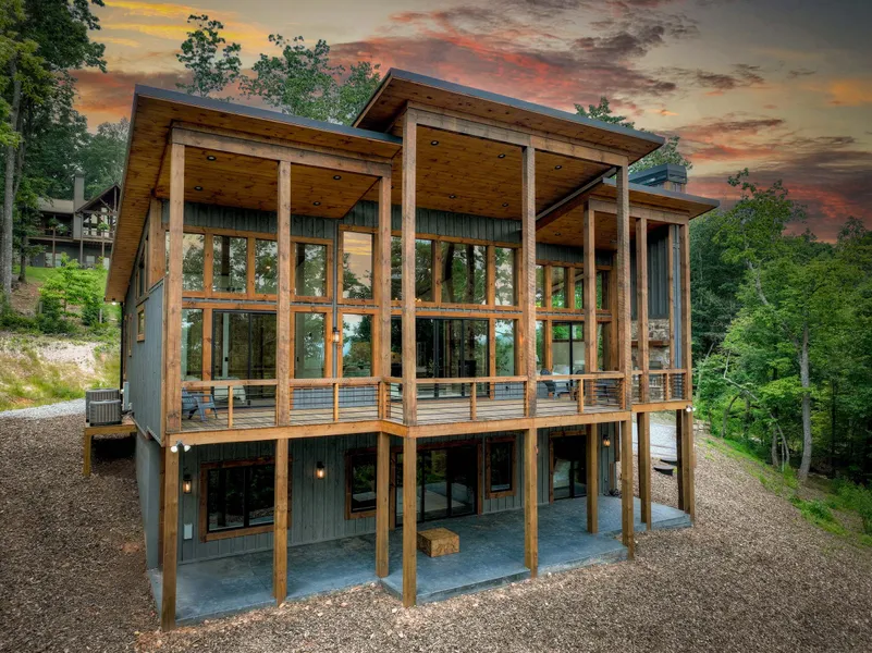 Brand new contemporary rustic chalet situated among lush forestry with gorgeous year-round mountain views, all within close proximity to downtown Ellijay and the most sought-after hiking and biking trails, this new construction creation makes for the perfect retreat. This home was thoughtfully designed with two levels of open-concept living, stacked stone fireplaces inside and out, large outdoor decks and luxury king suites. The space is the perfect blend of modern and rustic with bountiful natural light and walls of glass in every room. The main level boasts a large kitchen and eat-in island, a comfortable living room with stacked stone fireplace, large sliding glass doors leading to a large deck and a fireplace overlooking the layered views. Find two large king suites on the main level each with their own walk-in closets, tile showers and dual vanities. On the terrace level, the home i...