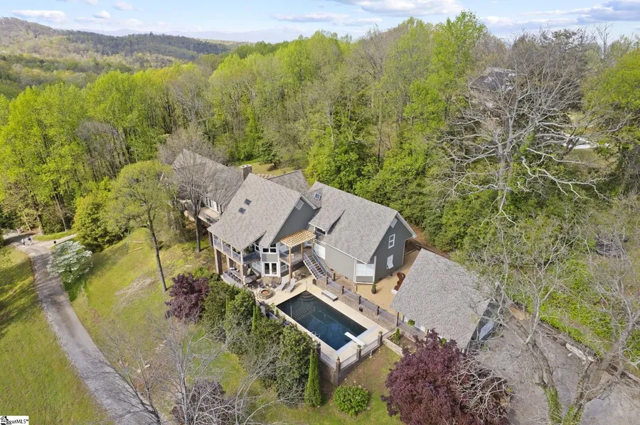 Listed by Kiersten Bell + Co | 864-567-1457 | | Perched high on the storied ridgeline of Paris Mountain, this 2.27-acre estate offers a once-in-a-lifetime opportunity to own a private, architectural retreat with panoramic views stretching from downtown Greenville to the iconic Table Rock. Whether you envision a multi-generational family compound, or a luxury mountain escape, this property delivers exceptional flexibility, privacy, and timeless appeal. From the moment you step inside, 902 Altamont Road radiates rustic sophistication. Tongue-and-groove pine cathedral ceilings, rich oak hardwood floors, and soaring windows draw in natural light and stunning vistas. The main level boasts two spacious primary suites—each with vaulted ceilings and spa-inspired bathrooms. The grand suite features a steam shower, heated floors, custom walk-in closet with private laundry, and a serene porch for quiet mornings or sunset reflections. Designed with entertaining in mind, the chef’s kitchen is outfitted with granite countertops, a premium gas and induction cooktop combo, dual wall ovens, and even a built-in fryer. The great room—with its dramatic stone fireplace and lodge-style ambiance—invites gatherings both grand and intimate. Upstairs, the original primary suite offers its own peaceful escape with a private balcony and soaking tub, while the lower level provides generous flexibility with media, guest, or rec space, plus three additional bedrooms and three full baths. Outdoors, the estate continues to impress: a four-car garage, winding driveway with turnaround, in-ground pool, and a resort-style outdoor kitchen framed in stone and rock set the tone for unforgettable entertaining. Meandering garden paths and curated sculptures lead to a private guest house overlooking the pool—ideal for extended family, visiting friends, or creative pursuits. Tucked into one of the most scenic and serene corners of the Upstate, 902 Altamont Road feels worlds away while remaining just minutes from downtown Greenville, Furman University, Travelers Rest, and the Swamp Rabbit Trail. This is not just a home—it’s a mountaintop legacy waiting to be written.