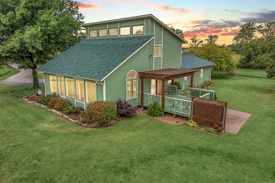 Passive Solar Country Home on 8.3 Acres – Beautiful Setting and Thoughtful Design This one-owner passive solar home sits on 8.3 peaceful acres just off Highway 50, offering energy efficiency, comfort, and stunning country views. Designed with purpose, the home is angled to capture the sun’s warmth in winter, while the south overhang provides cooling shade in summer. Inside, the large living room features oak built-ins, vaulted ceilings, and expansive south-facing Andersen windows that fill the space with natural light. The kitchen includes all appliances, a wall of pantry storage, and connects conveniently to the laundry room—washer and dryer included. The loft overlooks the main living area and offers an ideal spot for an office or reading nook. The home offers two en-suite bedrooms, one on each level, and a finished basement with a large rec room plus an additional room with an egress window—ready to become a third bedroom with the addition of a closet. Enjoy quiet evenings on the large, partially covered deck, perfect for outdoor dining or sunset watching. The property features a circle drive, natural gas (Atmos), rural water, septic system, and a new roof installed in 2021. Nicely landscaped and perfectly situated on blacktop access just minutes from town, this home offers the best of sustainable country living with modern convenience.
