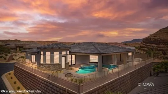 Spectacular Custom Home | Built in 2023 Elevated lot with sweeping southern views of mountains, mesas, fairways, and city lights. Unique saltwater pool and spa design features a large shaded section under the roof and a smaller sunlit area for lounging. Surrounded by travertine tile, the outdoor space includes a fire pit, built-in BBQ, and putting green. The great room centers around a stacked stone fireplace with dual sliding doors for seamless indoor-outdoor flow. Chef's kitchen offers a large granite island, Viking appliances, walk-in pantry, and butler's pantry. Luxurious primary suite with spa-style bath and walk-in tiled shower. All guest bedrooms feature private en-suite baths. Bonus room can serve as office, gym, or fourth bedroom. Octagonal game room includes wine fridge, ice maker, beverage fridge, and pool access. Half bath off pool area. Extended 3+ car garage with 12' RV bay...