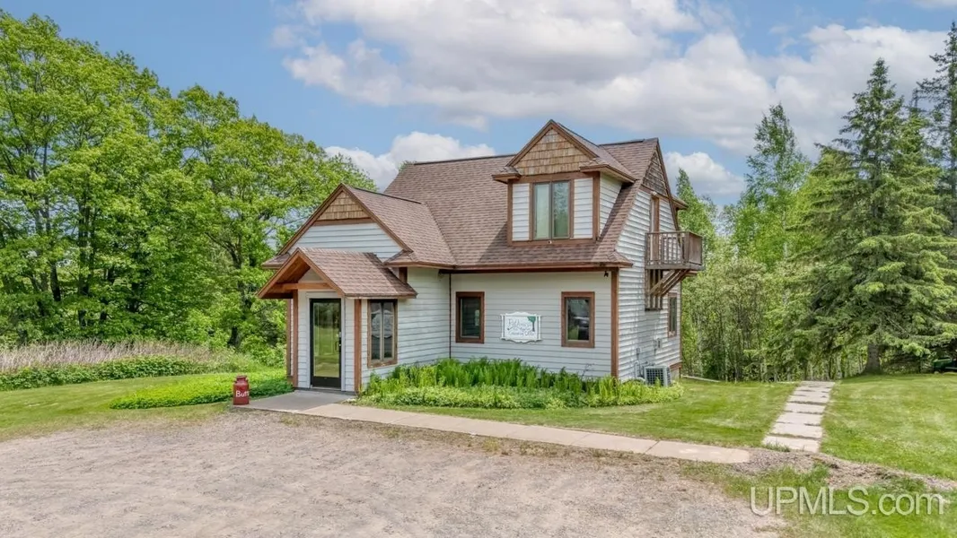 First time on the market! This property could continue to be used as a professional office with living space in the lower level, or convert it to a really cool residence! Professionally constructed, this 1,700 sq ft building was formerly an attorney’s office and is situated on a private 4.35 acre parcel in beautiful Spread Eagle. The main level already has a beautiful potential living room with a gas fireplace, while the reception area and storage closet could be converted into a kitchen with adjoining half bath that has plenty of room for a shower or tub. The upper level is awesome and would make a one of a kind huge bedroom with full bath. The lower level has a full bath and kitchenette, and could be finished out as a family room. But if you are a professional looking for a private place in the country to have your office, it is perfect as it is.