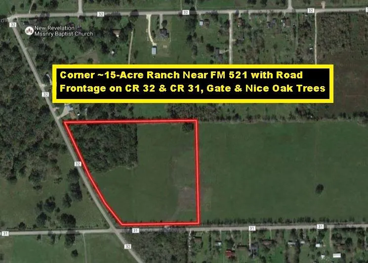 Ag Exempt! Corner 17-Acre Ranch Near FM 521 w/CR 32 & CR 31 Road Frontage. Nice Oak Trees. Needs Well/Septic! Low Taxes! Outside City Limits! Minutes to Angleton & TX-288. 25 miles to Proposed Grand Pkwy/TX-99, Pearland Town Center, Freeport Chemical Plants & Gulf Coast Marinas & Beaches. 40 miles to TX Medical Center & Downtown Houston. Perfect Location w/Great Potential. Can be Commercial, Residential or Mobile Home/RV Park. Grand Pkwy/TX-99 will be 180+ miles connecting League City-Rosharon-Katy-Tomball-Baytown (See Maps)! Contact Capital Farm Credit Union for Loan! Additional Acreage Available for Total of 47.6 Acres! Acreage, Road Frontage & Property Dimensions Are Estimates! Survey Required!