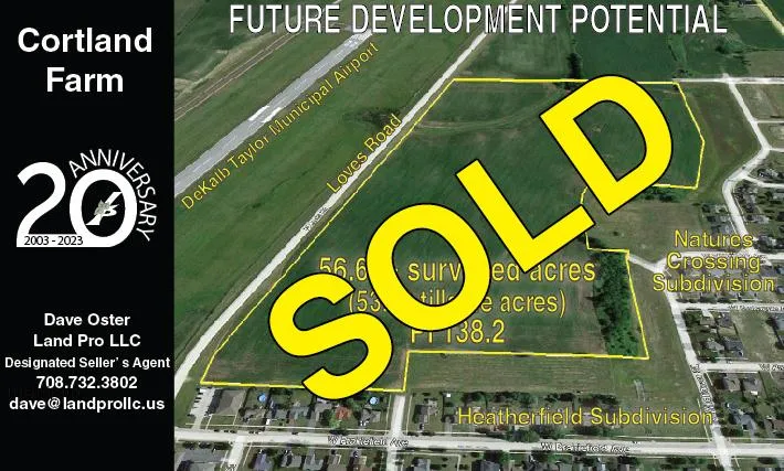 The Cortland Farm is platted for subdivision and is annexed to Cortland, Illinois. The property is in Section 17 of Cortland Township and contains 56.64 surveyed acres (53.69 tillable acres). The soils have a PI of 138.2 and are comprised mostly of Danabrook and Elpaso.