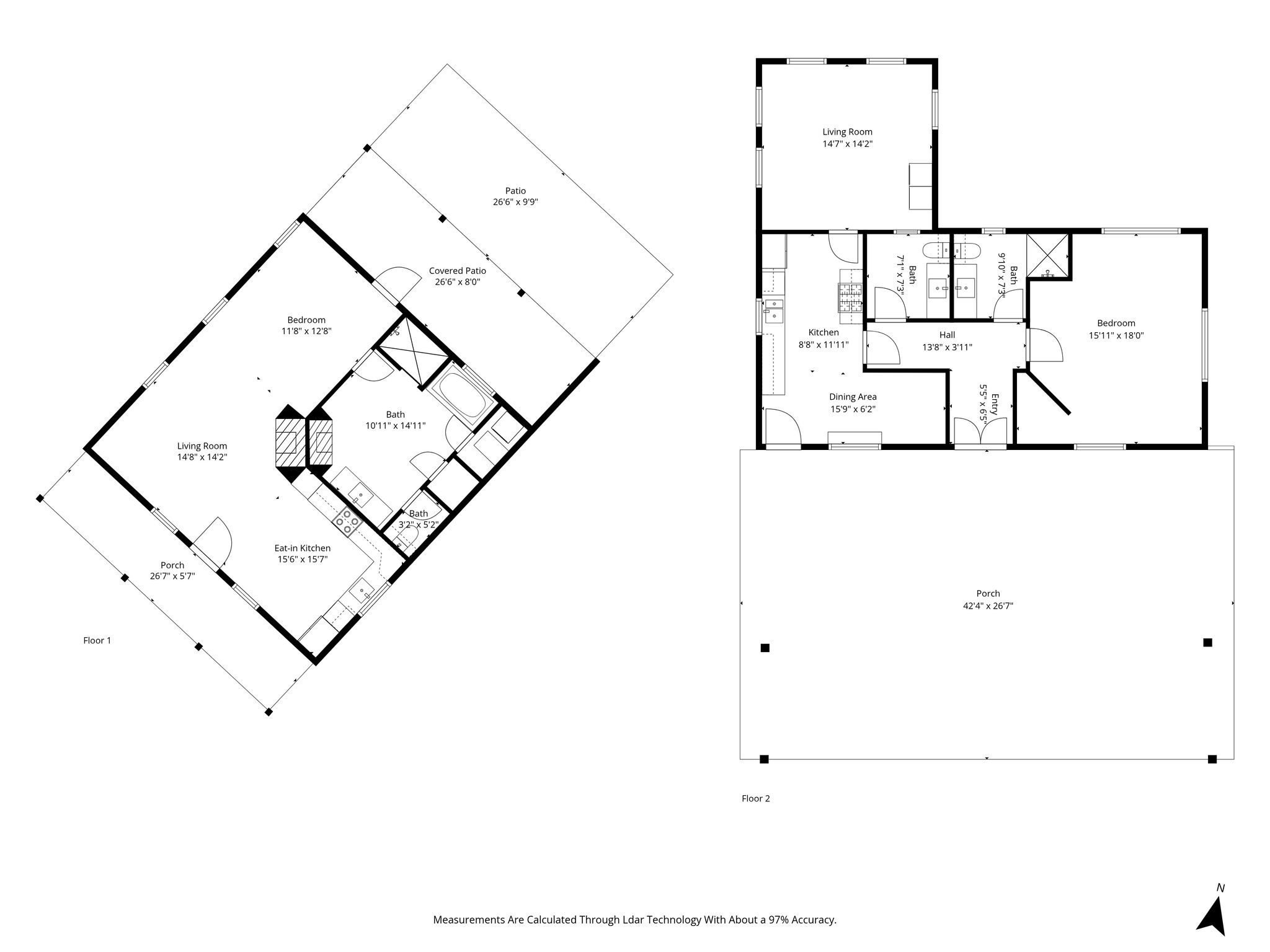 THE COTTAGE This storybook-style home is finished in durable fiber cement siding with a metal roof, combining timeless appeal with low maintenance. Inside, the open concept one bedroom, one bath layout feels warm and inviting, highlighted by concrete floors and a cathedral ceiling in the living room anchored by a gas log fireplace. The spa-inspired bath offers a tile shower and a slipper soaking tub across from a second gas log fireplace, perfect for unwinding. The kitchen features granite countertops, stainless steel appliances, and thoughtful details throughout. Expansive covered porches front and back, ideal for morning coffee and a hot tub for evening relaxation.