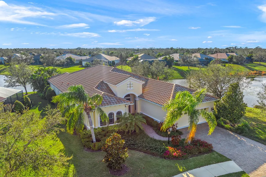 Driving through the gates of prestigious Country Club East you will arrive at the Viano del Mar built by Neal Signature Homes. This meticulously maintained three-bedroom custom residence, complete with an office-den and 2.5 baths, is on a private cul-de-sac, offering peace and tranquility. As you enter through the double entry doors, you will be greeted by a grand foyer and gallery leading you into the elegant dining area and sprawling great room where your eyes meet serene outdoor living. This one-owner home features extraordinary quality on the most exquisite corner lot, overlooking 180-degree scenic lake and greenbelt views. Over a quarter acre, the lushly landscaped property enhances the sense of privacy. Each room is adorned with decorative detail, volume ceilings, rich crown moldings, distinct open spaces and an abundance of natural light throughout. Window treatments, plantation shutters and automatic, custom Silhouette blinds adorn windows and sliding glass doors. The kitchen would delight the most cultivated epicurean showcasing stainless steel appliances, custom wood cabinetry, granite counters and sprawling breakfast bar, overlooking the sparkling, turquoise heated pool and spa. A well-appointed main-level primary suite offers a retreat with two walk-in, custom closets, a bay window and en-suite bath with dual sinks, granite, walk-in shower and soaking tub. Additional amenities include a spacious laundry room, paver walkways and patios, storm shutters, front impact glass windows and automatic poolside awning. The expansive outdoor living space is ideal for entertaining complete with an outdoor kitchen for alfresco dining. An exemplified level of perfection that is entirely uncommon. Residents can enjoy community amenities at The Retreat, with a clubhouse, fitness center, resort-style pool and nature walking trails. Available Lakewood Ranch Country Club membership, two clubhouses, fitness centers, restaurants, three 18-hole championship golf courses, tennis, pickleball, lap pool, along with social events. Ritz Carlton Club memberships, with Tom Fazio-designed 18-hole championship course as another option. Conveniently near Waterside, University Town Center, dining, shopping, schools and parks are conveniently minutes away. Enjoy visiting westerly white sandy beaches, barrier islands and easy access to Interstate 75 and Sarasota International Airport.