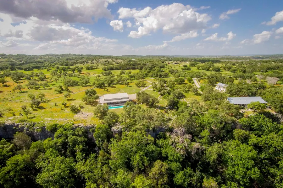 Low taxes due to wildlife exemption, Gated community with no HOA. Main house, guest quarters, pool house and pool with 98% of cedar removed. Your own private waterfront on the Pedernales River. Located across from the Pedernales River from Reimers County Park.