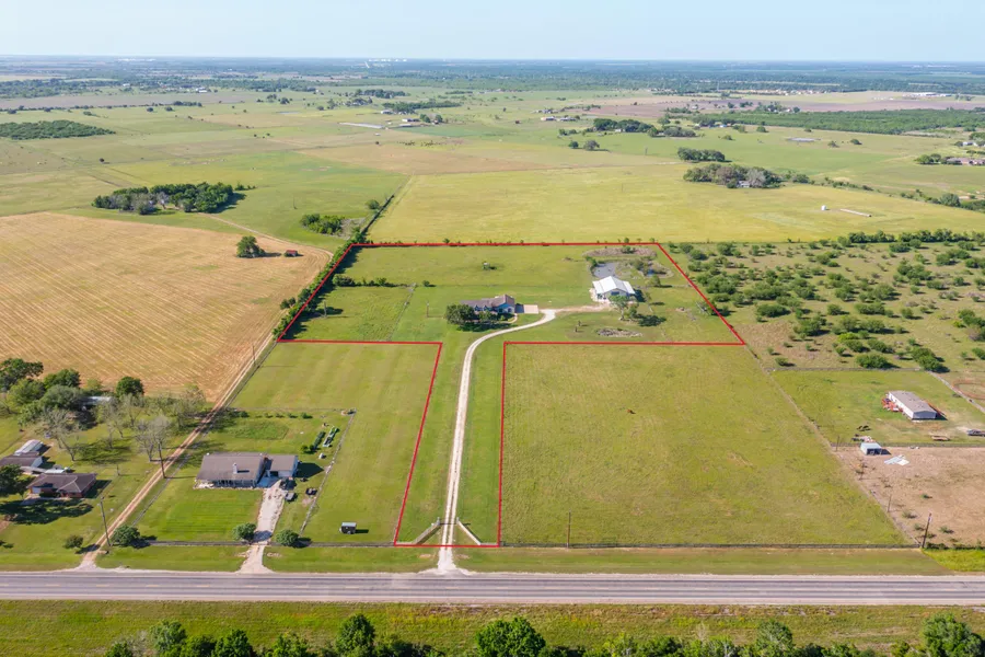 Welcome home to 3021 W FM 1093 in Wallis, TX and zoned to Brazos ISD! This country estate features a custom home and 4,320 SF commercial building, 2,400 enclosed, air conditioned office space w/ full bathroom built in 2021 on just over 15 acres! This home features 4 bedrooms, game room, home office/5th bedroom, 4 full bathrooms, 1 half bathroom, 2 covered porches, oversized 4 car garage and a 24 kw Koehler whole home generator! The spacious kitchen features an island w/ sink, double oven, stainless steel dishwasher, bay window, tongue & groove beadboard ceiling and room for bar seating! The family room boasts rich wood paneling, wood flooring and a wood-burning/gas stone fireplace! End your days in the spacious primary bedroom suite with roomy full ensuite bathroom. Upstairs are two large bedroom suites, each with a full bathroom. Don't forget to check out the wraparound front porch and impressive commercial building! Don't miss all this property has to offer! Schedule your tour today!