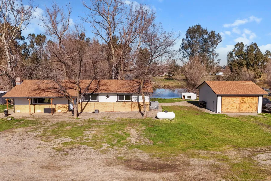 Country home on 8.88± acres offering a peaceful rural setting with a scenic pond and mature trees outlining the property for added privacy. Conveniently located close to town, yet the setting feels surrounded by countryside, providing the quiet and space of country living. This three-bedroom, two-bathroom home features an open floor plan designed for comfortable everyday living, highlighted by a cozy fireplace that adds warmth and character to the main living area. The farm-style kitchen includes a large window overlooking the pond, and a sliding glass door open to the backyard. The front yard offers a covered porch area, perfect for enjoying the surrounding countryside. Wide open space from neighboring properties provides room to relax and enjoy the quiet of country living. A detached two-car garage offers additional storage and flexibility.