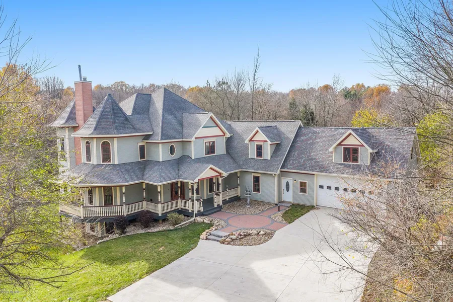 Nestled in a private wooded setting minutes from Mattawan and I-94 is this beautiful 6 BR / 4.5 BA home, ideal for country living, working virtually, creating family memories, and living sustainably. All of this, and still near town, and with a long list of features: large wraparound porch; high ceilings throughout; gourmet Kitchen, that flows into Living Room w/wood burning fireplace; multiple spaces ideal for working from home; Master Suite, with gas fireplace; large walkout level, with 2 BRs, living area, and Office; oversized 4-stall drive-through garage, ideal for workshop or studio geothermal heating & cooling, large fenced area for dogs or other animals, high-speed internet, and more. Located on the county line. Kalamazoo County and Mattawan Schools are across the street.