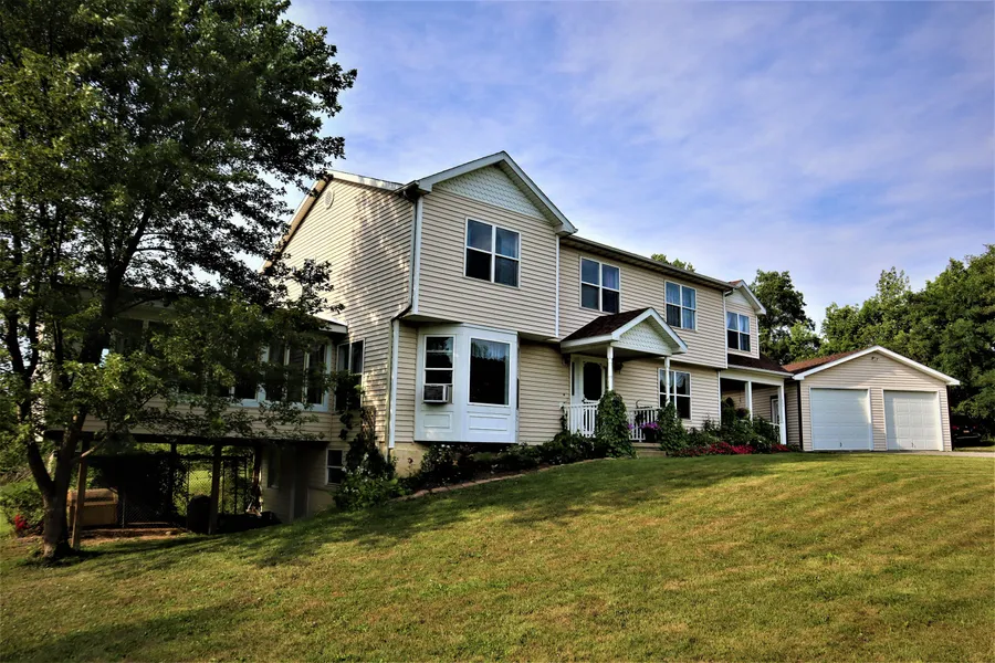 Whitetail properties is pleased to present an immaculate country colonial home with a barn, riding ring and detached garage on scenic private acreage in East Bethany. This home is no doubt the perfect place for a large family with huge rooms and an open country kitchen with two dish washers for holiday gatherings. Connected to the kitchen dining room is a library and a continuing flow to a large family room. This design is complimentary to the entire family being together, while sharing meals, studying or relaxing by the warmth of a Quadra fire wood burning unit. A bonus to enjoy is a three season room with french doors connecting to the family room. Enjoy views south and west from this vaulted ceiling retreat. Sharing the approach, this home has a long driveway leading past a riding ring to a scenic home location and barn with southernly views and a detached double garage. A covered porch greets you at the entry to your home and has a porch swing looking over the south lawn and riding ring, while the back yard has a small deck and overlooks a garden space and view to the barn and a large lawn. The basement is as large as the first floor, and could be finished into more living space or continue to use it for organized storage and pantry space. A detached double car garage is close to the house, with a breezeway to the back yard between the house and garage. The property has four main fields that were once open pastures and now are fallow but could easily be brought back to production with little work. Beautiful views and gentle slopes make up the farming ground and lead to a woods that is a popular home for a large population of deer and turkey. The two story barn (2003) has several stalls for horses, goats or sheep and a hay mow above. A pasture is still fenced if you have livestock and can enjoy hobby farming here with ease. Central to Batavia, Warsaw and other commuter towns, this home is rare find of this quality with all the country living compliments. Check this one out, priced well to sell!