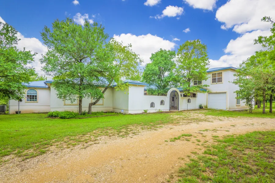 Country living just 20 minutes to south Austin. Enter the property through the electric wrought iron gate. The entrance to the home offers a gated courtyard. So many features, some of which include two master en-suites, one on main level and one up. There are also 2 secondary rooms also plus a game room with kitchenette and 2 full baths. Three ac units replaced in 2020 and 2012, 2 water heaters, one replaced 2021 and the other is tankless and replaced in 2012. Septic and well are just 2 years old. Beautiful acacia wood custom built-ins located in kitchen, breakfast room, great room, office, craft room, master bathroom, master closet. Main level master offers 2 water closets, a separate craft room and office and a safe room. Mounted TVs convey along with all appliances. Three car garage with air conditioned and heated workshop and full bath. Outside you'll find a green house and a 2 acre pond to go canoeing or fishing. It's stocked with bass, perch and more. Wildlife abounds with deer, turkey and ducks.