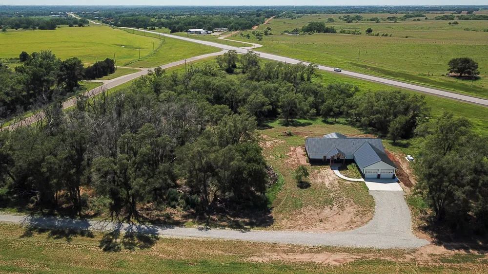 This brand new 3 bed, 2 bath, model home/barndo, constructed by Yoder Engineered Structures, on the outskirts of Kingman, Kansas is ready for you to move in! Located 2 miles east of Kingman just off Highway 54 on a 5.55 +/- acre timbered lot, this spacious 2,126 square foot home features an open vaulted living, dining, and kitchen space with custom knotty hickory cabinets and trim throughout! In addition to the custom cabinetry, the kitchen has been equipped with stainless appliances including a dishwasher, electric stove, microwave, and refrigerator. Additional cabinets and countertops were installed to the side of the kitchen allowing for a desk area and additional workspace or coffee bar. Separated by the main living space, 2 bedrooms and a full bath are located on the south side of the house and the master suite, mud/laundry room, utility room, and garage access are on the north side. The master bath includes a large walk-in Onyx shower, a nice deep soaker bathtub, a double sink vanity, an isolated toilet room, and a roomy walk-in closet! The bedrooms and closets are all carpeted, the bathrooms have ceramic tile, and the main living space has knotty hickory waterproof vinyl plank flooring to go with the custom cabinets and trim.