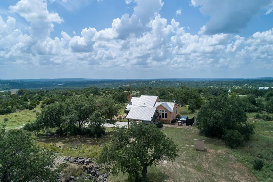 Perched atop 10+ acres of picturesque terrain, this exceptional property showcases panoramic views and exclusive access to the Pedernales River, all within minutes of Johnson City's bustling amenities. Easy country living personified in this 2200 sf 3 bed, 2 bath open floorplan limestone cottage. Outfitted w/ a gourmet kitchen, wine fridge, custom cabinetry, and eat-in kitchen island. Tranquil master suite opens to a private hot tub and outdoor shower. Comfortable guest accommodations allow for flexibility with a built-in murphy bed suitable for office space as well. Standout 1200 sqft heated and cooled metal building affords work space for projects.