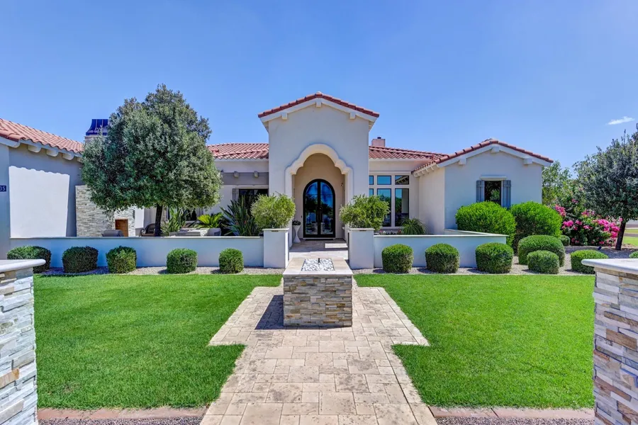 Experience luxury living in this exquisite single-level estate offering 5 spacious bedrooms, 4 bathrooms, and an impressive 4,100 sq ft of modern elegance. Situated on a private 1.25-acre lot, this home blends refined design with exceptional indoor/outdoor living. Step inside to rich wood flooring, soaring ceilings, and a seamless open layout. The chef's kitchen features high-end appliances, a large island, and custom cabinetry—perfect for entertaining. A formal dining room sets the stage for elegant gatherings, while the cozy gas fireplace in the living room adds warmth and charm. An expansive bonus/game room opens directly to the beautifully landscaped backyard, creating a natural flow to outdoor enjoyment. The private courtyard with a fire place offers a peaceful retreat, while the backyard boasts a gorgeous pool surrounded by lush landscaping, perfect for relaxing or entertaining. Additional highlights include a spacious 4-car garage, a luxurious primary suite, a flexible floorplan, fully fenced areaideal for a play area, garden, guest casita, or future sports court. The possibilities are endless. Don't miss this rare opportunity to own a modern masterpiece with thoughtful design and room to grow!