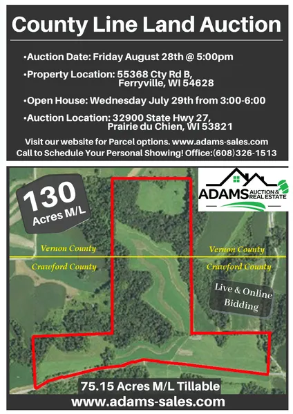 Own this 130 acres m/l located in the heart of Big Buck country in Crawford/Vernon county Wi. This property boasts great income opportunity as well as natural funnels for whitetails with large ridgetops for easy access to your hunting stands. The 130 acres M/L has approx. 75 acres tillable acres which is currently in grass hay and has an option of being certified organic. This property has not changed hands in over 60 years and may not be offered again for many years to come. Property to be offered in multiple parcel options. Auction date is August 28th, please see website for terms and details.