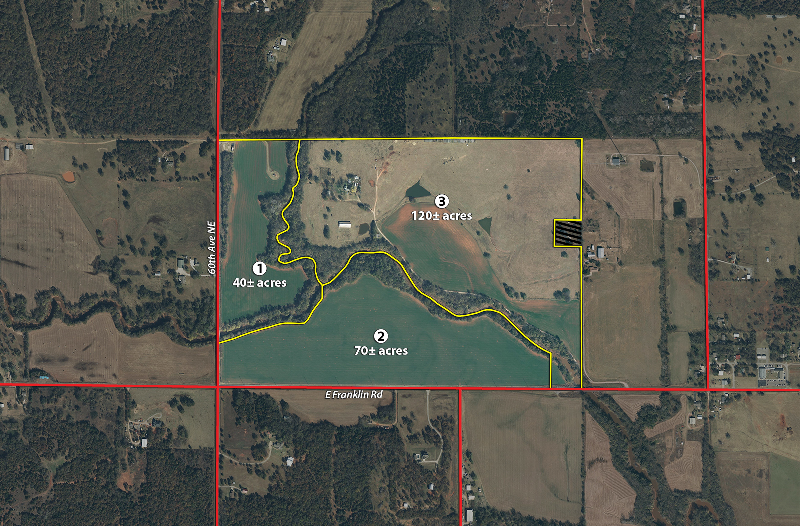 FRANKLIN RD & 60th AVE NE RIDGETOP VIEWS OF SURROUNDING LANDSCAPE CONFLUENCE OF LITTLE RIVER & ELM CREEK EXCELLENT POTENTIAL BUILD SITES QUALITY BOTTOMLAND SOILS THREE SURFACE PONDS
