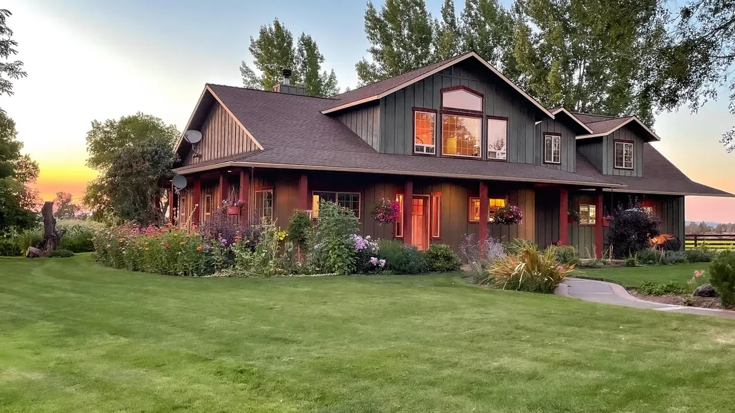 Family held ranch over 4 decades. 80 acres total with Central Oregon Irrigation water rights. Perimeter fenced and divided into hay fields and pastures. Farmstead totals 2 acres enclosed with board fence. Immaculate landscape, fruit trees, shade trees and Cascade mountain views. Main home is 3000 SF custom built in 2004. There is an adjoining 1700 SF 2004 Fuqua manufactured home, 75' x 40' barn with concrete floor. An adjacent 1000 SF heated garage 2 bays with electric garage door openers. Private well and septic. Front facing pond and additional 3 ponds in pastures. Landscape irrigation system with buried mainline and irrigation pipe serving outlying lawn. Shade trees line the paved driveway. The main house features downstairs great room, entry foyer, kitchen, utility room and primary suite. Hardwood flooring throughout the main floor, tile in utility and bathrooms. Kitchen has granite ...