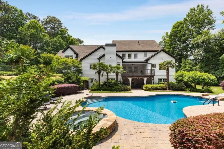 Welcome to your private resort-style sanctuary-an extraordinary retreat nestled on 3 lush acres in a quiet cul-de-sac with over 500 feet of peaceful lake frontage and a showstopping backyard oasis with a custom pool surrounded by lush landscaping and palm trees! This fully renovated masterpiece with 2 primary suites offers over 7,000 sq ft of elevated living, where luxury meets comfort and every detail is designed for relaxation, entertaining, and enjoying life to the fullest. Arrive via a brand-new winding driveway and step onto the inviting covered rocking chair front porch, where views of the manicured front lawn set the tone for the warm, welcoming lifestyle this home offers. Inside, you're greeted by a spacious, light-filled library with custom built-ins. Just beyond, a formal dining room easily seats 12-perfect for unforgettable entertaining. The vaulted living room with cozy fireplace flows into the heart of the home: an open-concept kitchen and keeping room with a second fireplace. The kitchen, completely updated in 2025, is a chef's dream with sleek quartz countertops, custom cabinetry, gas cooktop, double ovens, walk-in pantry, sunny breakfast area & breakfast bar-all open to the keeping room with fireplace. This space opens to a large deck with views of the stunning backyard. Around the corner, a beautifully designed utility wing includes a stylish drop zone and oversized laundry room with sink and ample storage. The main-level primary suite is a peaceful retreat with dual custom walk-in closets and a spa-like bath featuring new cabinetry, designer tile, deep soaking tub, and oversized shower-all overlooking the private pool. Upstairs offers 4 oversized bedrooms, 3 full baths, and 2 large hall walk-in closets for extra storage. Two bedrooms are en-suites; the others have private vanities. A second primary suite is set apart for privacy-ideal for a sitting area, office, or long-term guests, complete with en-suite bath and large walk-in closet. The terrace level is an entertainer's dream-featuring a home theater, spacious rec room, separate billiards room, and fully equipped second kitchen with bar and seating. A large workshop provides space for hobbies or storage. A 6th bedroom with walk-in closet and full bath is currently used as a fitness room and offers even more flexibility-perfect for multigenerational living. But the outdoor living space is the true showstopper. The terrace level opens to a covered patio that flows into a spectacular resort-style pool area. Surrounded by palm trees and lush landscaping, the heated gunite pool includes custom stone steps to a waterslide, built-in splash pad, and a stunning stone fireplace. A separate firepit area is perfect for evenings under the stars. The level backyard offers endless space for entertaining and play, with a batting cage and dedicated play area blending seamlessly into the grassy level private lawn. All of this overlooks 500+ feet of peaceful lake frontage with a private dock-ideal for fishing, kayaking, or launching a canoe. Great location - about 15 minutes from downtown Alpharetta / near Canton / schools / shopping Thoughtfully updated throughout with fresh interior & exterior paint, newer HVACs, 2 water heaters & designer finishes. This one-of-a-kind home offers luxury, space, privacy & a year-round resort lifestyle. Welcome to your forever home. Possible owner financing.