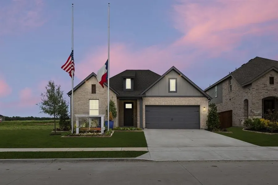 MLS# 21144216- Built by RockWell Homes - Ready Now! ~ New single-story home offers 4 bedrooms and 2.5 bathrooms, home office, plus a 2-car garage, making it the perfect fit for everyone who need extra space. The exterior showcases a classic full brick exterior, a welcoming covered porch, and energy-efficient dual-pane windows, providing both curb appeal and cost-effective comfort. Step inside to find an open-concept layout that seamlessly connects the kitchen, living, and dining areas, all situated at the back of the home for added privacy. The living area is bathed in natural light from multiple dual-pane windows overlooking the covered patio. The kitchen is a standout feature, complete with an island that includes a bar-top seating area. It's designed for both function and style with solid surface countertops, an undermount sink, GE stainless steel gas appliances and a walk-in pantry. Additional kitchen amenities include a stainless-steel microwave, dishwasher, gas range oven, Delta faucets, 42-inch cabinets, a ceramic tile backsplash, upgraded flooring, and recessed can lighting, making it a chef's dream. The primary bedroom suite, located at the rear of the home for ultimate privacy, offers a luxurious retreat with dual sink vanities, ceramic tile flooring, a garden tub, and a ceramic tile shower with a glass enclosure. This suite also includes Delta faucets, a stylish lighting package, and a matching hardware package. The secondary bathroom features ceramic tile flooring and tub-shower enclosures, as well as Delta faucets and a lighting package to complement the home's elegant design. This home is further enhanced by a full landscaping package, fully fenced in private back yard, a full sprinkler system, full gutters, a garage door opener, a ceramic tile utility area, and a new home warranty for peace of mind. Residents enjoy quick access to downtown Dallas, I30, I635, I20, PGBT 161, shopping & dining.