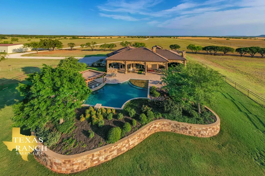 The ranch is low fenced and cross fenced with a gated entrance that opens to a well-maintained gravel ranch road that navigates straight to the headquarters area. Towards the center of the property stands a gorgeous and luxurious three-bedroom and four-bathroom 3,400 square-foot custom home. The Mediterranean-style home features double glass and iron doors at the front entrance that open to spacious living areas with wood-beamed ceilings, a floor to ceiling fireplace, and huge windows which allow natural light to flood the house. The breathtaking gourmet kitchen boasts a separate island and a cooktop that sits within a custom rock alcove and is surrounded by custom cabinets and granite countertops. The space behind the home is well suited for entertaining and relaxation, featuring a covered patio with an outdoor kitchen, stone fireplace, and stained concrete floors. The patio area looks out towards the ranchs breathtaking pool, which is flanked by a sunken gazebo and a firepit with a stone seating area.