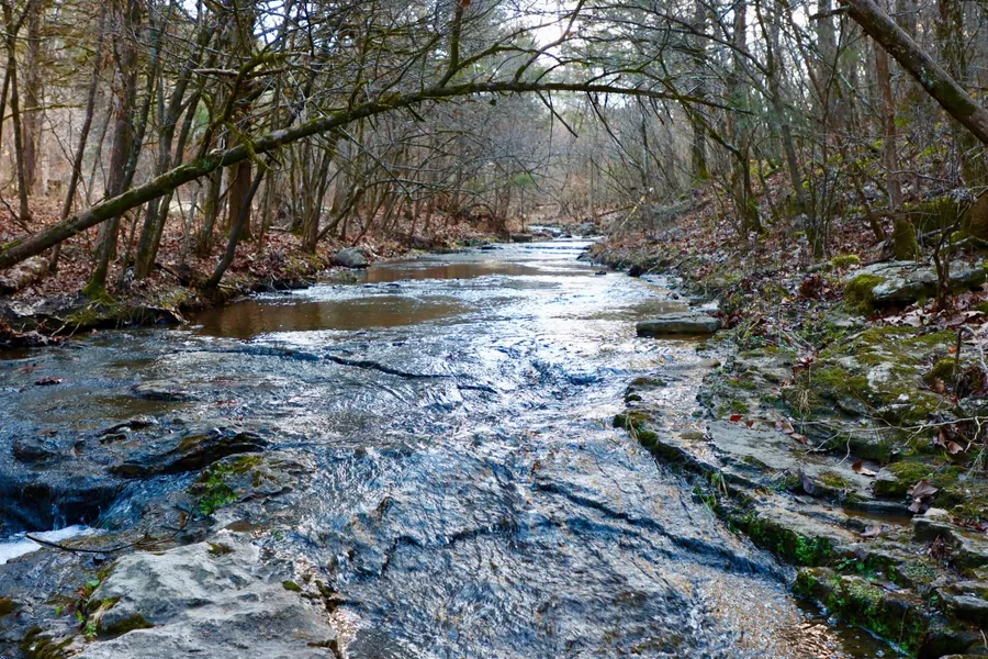 From the gated entry off Norfork River Road, there is a 1/2 mile-long chat driveway back to the property. This driveway is a deeded easement that meanders through the woods and enters the property on the western boundary. You’ll cross one bridge before approaching the cabin, with multiple breathtaking views of the creek. The year-round creek is mostly flat rock bottoms and carries some of the clearest water you’ll ever see. The creek bottoms have been cleared in multiple areas giving way to easy access and better views for the owners and their visitors. Throughout the property, there are multiple hiking trails with directional signs, as well as some ATV trails.