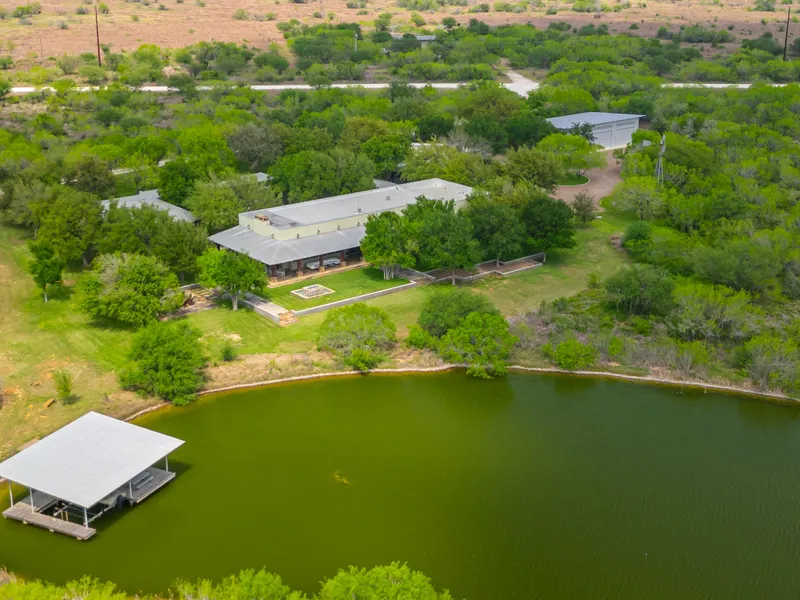 The luxurious contemporary main lodge sits adjacent to a 7-acre lake with expansive porches, a boat house, a fire pit, pool/spa and outdoor dining with fireplaces for entertaining on cooler nights. The custom-designed lodge was built to the finest detail and includes a den, sitting room, dining room, and breakfast room included in the huge kitchen. The master bedroom is separated from the lodge and the eight guest cabanas all surround a lovely courtyard with a water fountain and live oaks. There is a game room and TV room adjacent to the main lodge. Next to the main lodge is a classic gun room for preparing for the hunt and a large enclosed equipment barn to hold the many quail rigs and hunting trucks.
