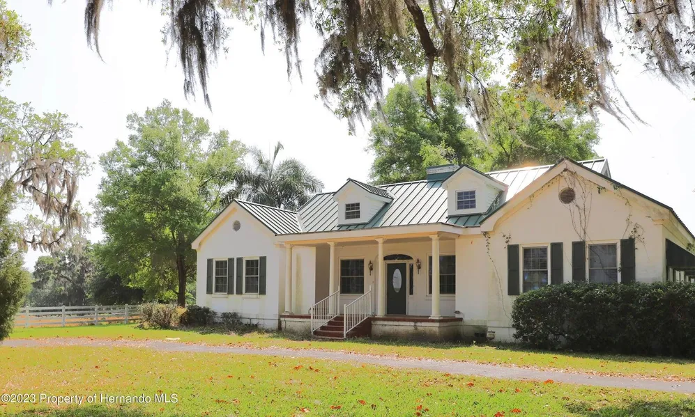 Stunning Historic Estate. 4/3 home situated just outside of Brooksville FL atop a hill overlooking the Brooksville Golf and Country Club. Total of 33.9 rolling acres. Looking for a FAMILY COMPOUND? This listing is already broken into five parcels, meaning there are 4 more possible homesites. Majestic grandfather oaks flank and shade the main home. White brick construction with green metal roof built in 1946 (Roof installed in 2008). Wood burning fireplace. Large 320 sq ft Laundry Room with lots of counter space for folding and cabinets for storage. Remodeled kitchen with granite countertops and stainless steel appliances. Hard Wood Floors. Plantation Shutters throughout. Detached 594 sq ft building with full bath, could be used as a game/hobby room. Gated Entrance. Fully Fenced and Cross Fenced with white vinyl fencing. 792 sq ft workshop/AG equipment storage with attached 1,892 sq ft pole barn. This sprawling ranch is located in Hernando County FL only about 45 minutes from Tampa FL about an hour from Ocala FL and just a little over an hour from Orlando FL.