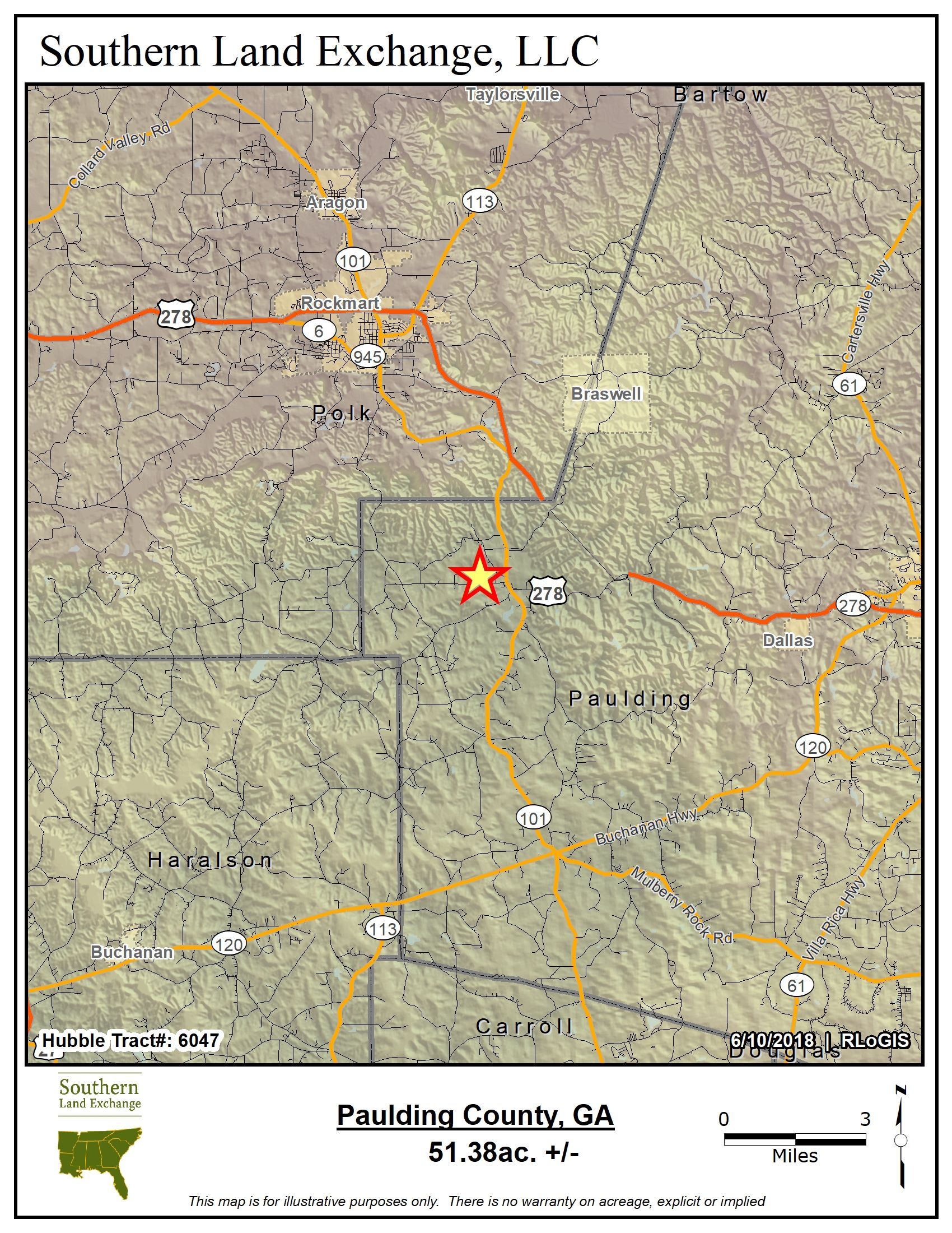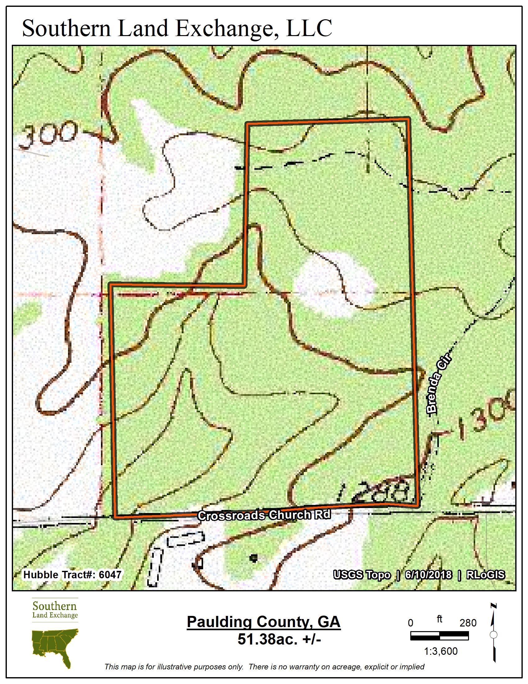 Conveniently located in west Paulding County this easy to access 51 +/- acre tract is just 1/2 mile west of Ga. HWY 101 and 3.5 miles west of US HWY 278. Located 11.5 miles west of Dallas and 8 miles south of Rockmart this well managed tract of land offers hunting/recreational opportunities as well as residential possibilities. This property has mature, well managed timber stands that include pine and natural hardwood. There is 1,500 feet +/- of paved road frontage on Crossroads Church Road. All of these features create a unique investment opportunity.