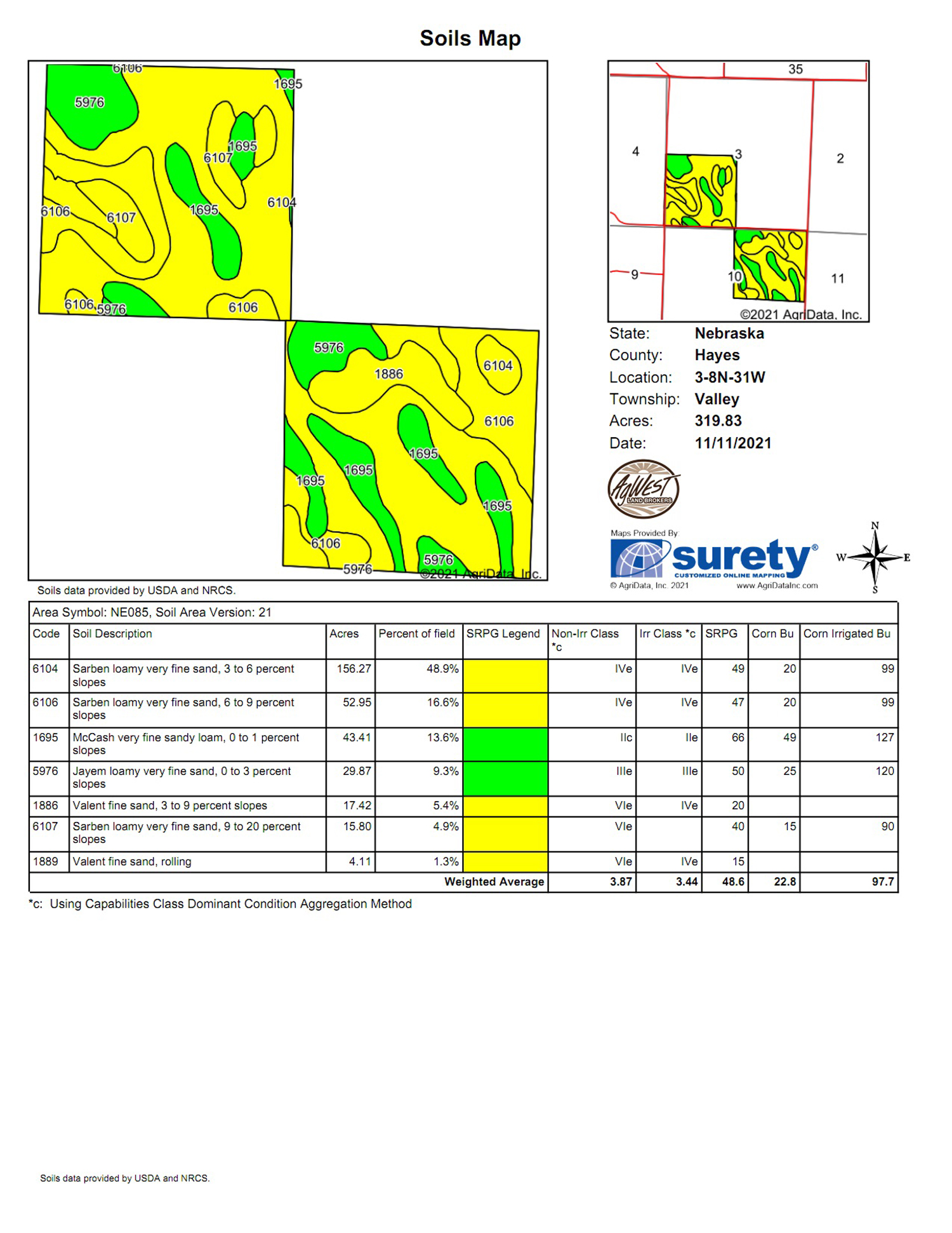 Heres a new investment opportunity in Hayes County, Nebraska that includes a total of 319.83 +/- acres being offered in two tracts. Both properties have been recently re-enrolled into 10 year CRP contracts that expire on 9/30/2030. There are a total of 281.52 +/- acres currently enrolled into CRP, with an annual payment of $13,231.44 which is $47/acre. The land has also been enrolled in the Pheasants Forever Walk-in Access Program that pays an additional $8/acre on all 319.83 +/- acres, expiring in 2026.